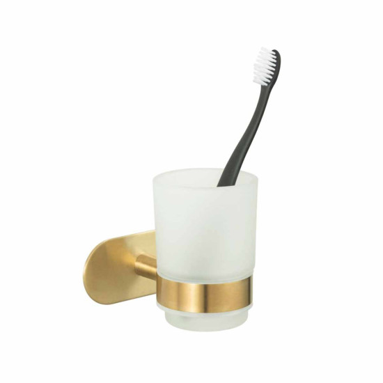 Dajte svojoj kupaonici nešto sigurno s visokokvalitetnom serijom kupaonskih dodataka Orea Gold Matt tvrtke WENKO. Elegantni kupaonski pomoćnici spajaju funkcionalnost i kvalitetu i jednostavno se pričvršćuju na zid bez bušenja pomoću sustava ljepila Turbo-Loc®. Kupaonska serija izrađena je od visokokvalitetnog nehrđajućeg čelika. Zlatni, mat dizajn daje kupaonici čistu eleganciju bez da djeluje nametljivo. Elegantna Uno Orea čašica za četkicu za zube može se zasebno pričvrstiti na zid. Uklonjiva čašica od satenskog stakla savršena je za pohranjivanje pribora za četkanje zuba, kozmetike ili pribora za brijanje. Ukupne mjere kupaonskog pomagala (Š x V x D): 10 x 9,5 x 10 cm.