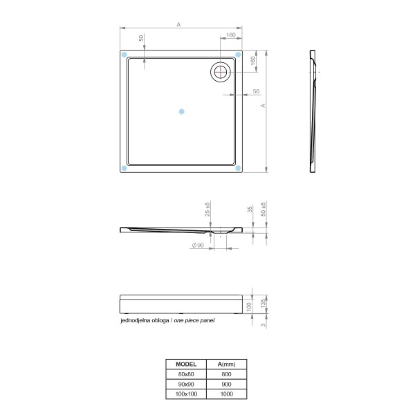 Teso je plitka tuš kada prvenstveno namijenjena ugradnji u razinu poda, ali je dostupna i u verziji s oblogom. Kvadratna verzija ove tuš kade dostupna je u nekoliko standardnih dimenzija.