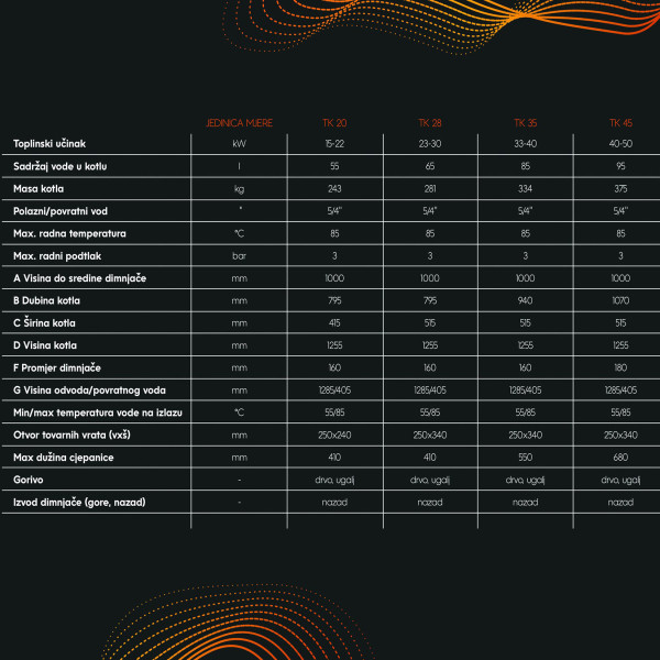 Kotao TK je predviđen za loženje svih vrsta čvrstog goriva (drvo, ugalj, briket). Izrađeni su od kvalitetnog čeličnog lima debljine 5 mm u ložištu i proizvode se u snagama od 20, 28, 35 i 45 kW. Dizajn konstrukcije je jedinstven s cijevnim izmjenjivačem što osigurava puno veće iskorištenje u usporedbi s klasičnim kotlovima na čvrsto gorivo. Cijevni izmjenjivač povećava površinu preko koje se toplina prenosi na vodu, smanjuje temperaturu dimnih plinova i samim time smanjuju potrošnju energenta.