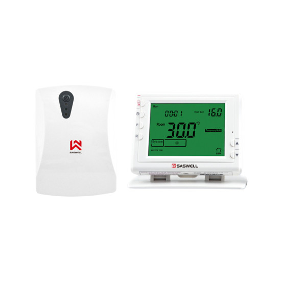 Termostat SASWELL je klasični programski digitalni sobni termostat koji dolazi u paketu s prijemnikom za kontrolu grijaćeg uređaja. Zbog svoje jednostavne uporabe i dugog raspona veze, prvi je izbor među kupcima bežičnih programibilnih tjednih termostata. Potpuno digitalna veza između termostata i prijemne jedinice omogućuje pouzdanu i stabilnu vezu između uređaja s mogućnošću povratne informacije u slučaju gubitka veze između uređaja.