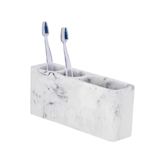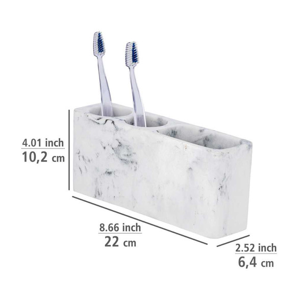Koristite svakodnevnog pomoćnika, na primjer, za jasno organiziranje električnih četkica za zube, ručnih četkica za zube i tubica paste za zube. Svojom jednostavnom elegancijom uklapa se u svaku kupaonicu ili gostinjski WC i omogućuje ujednačeno opremanje. Kao višenamjenski vrhunac, spremnik se također može koristiti u drugim prostorijama. Zahvaljujući svojim dimenzijama (Š x V x D) 22 x 10,2 x 6,4 cm, držač pristaje i na radni stol i osigurava uredno pohranjivanje uredskog pribora. Pribor je izrađen od visokokvalitetnog poliresina. Ovu plastiku karakterizira dugotrajnost, stabilnost i autentičan osjećaj. Budući da su nam dugovječnost i održivost važni, koristimo visokokvalitetne materijale. Ostali kupaonski dodaci u modernom mramornom dizajnu dostupni su iz serije Desio. Stvorite svoju opuštenu oazu blagostanja i nadopunite svoj kupaonski namještaj odgovarajućom čašicom za četkicu za